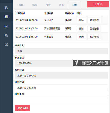 例如:學生說三天后在來院,可針對該學生添加一個回訪計劃,時間設定在三天后,到第三天系統會自動提醒對該學生進行回訪跟蹤。